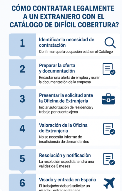 La contratación de una persona extranjera no residente en España para una ocupación recogida en el Catálogo de Ocupaciones de Difícil Cobertura (CODC) sigue un procedimiento claro, regulado por el Reglamento de Extranjería (RD 557/2011).